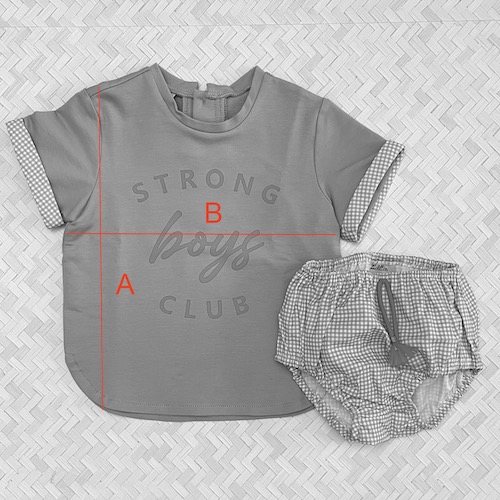 LOLITTOS colección AROMA Primavera – Verano 2026, conjunto niño de camiseta color MENTA con letras en CORAL, con doblete en manga en tejido vichy. Abertura trasera botón. Cubre en tejido vivhy con cordón coral. Cintura engomada.
