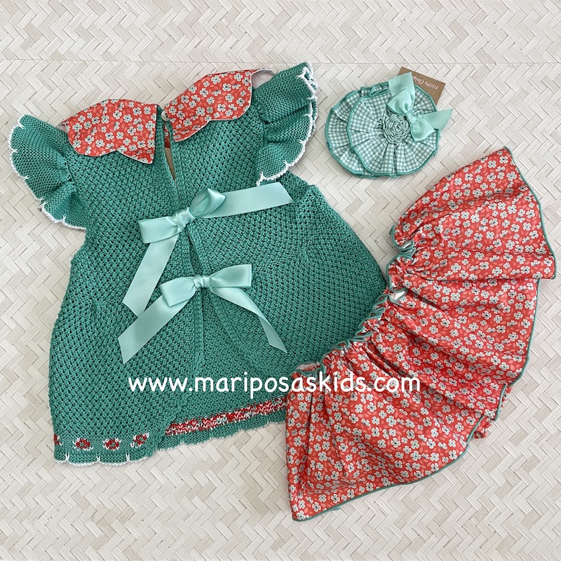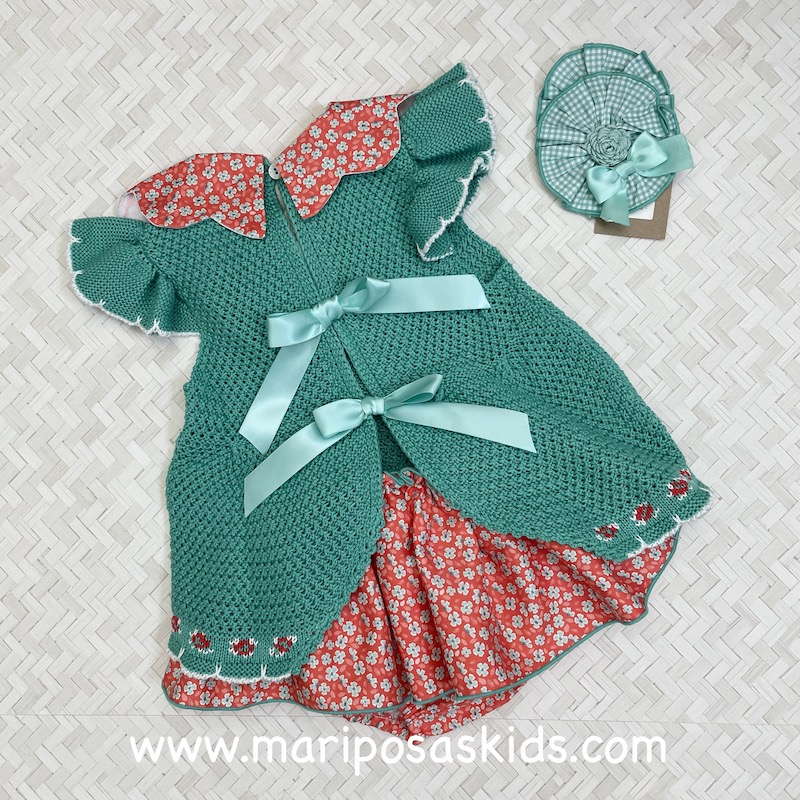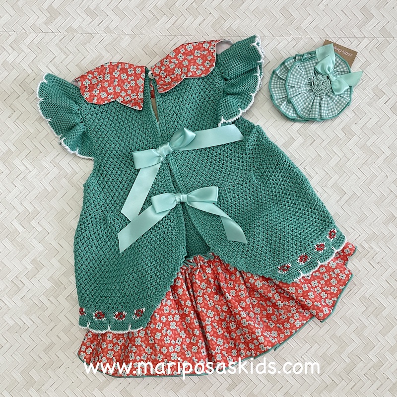 LOLITTOS colección AROMA Primavera – Verano 2026, conjunto compuesto por Top de punto en color verde menta con acabado ribeteado en blanco, de corte evasé con gran volante en cuello en tejido de flores menta sobre fondo coral. Destaca su espalda con abertura, decorada con dos lazos de raso menta. Cierre trasero con botón.