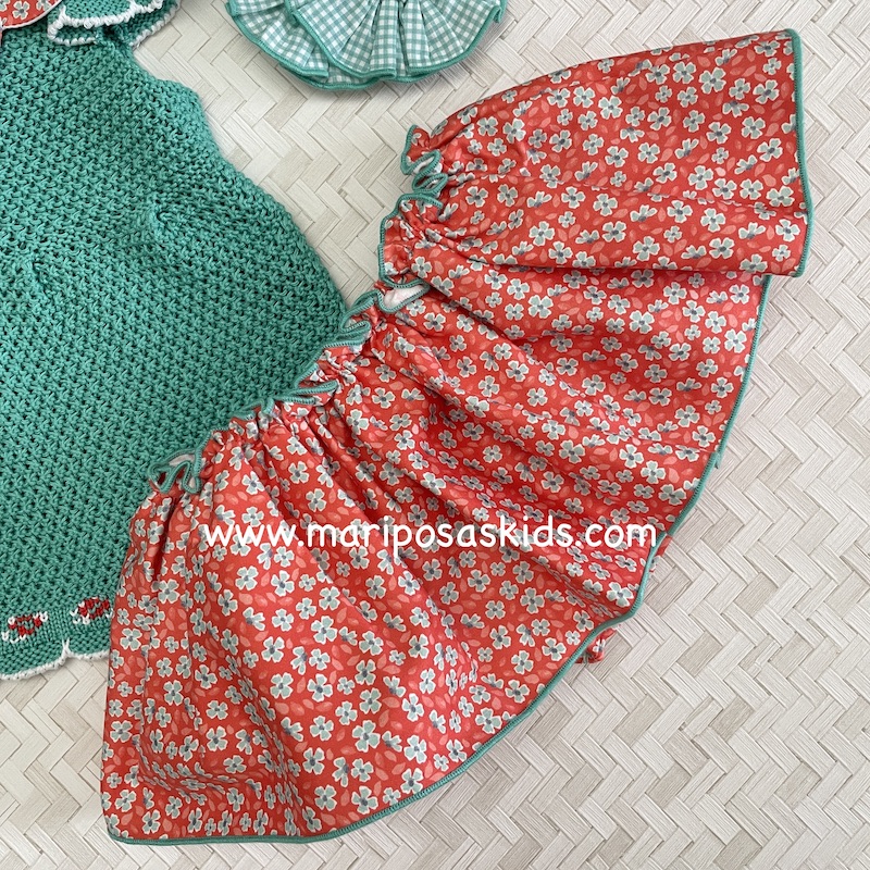 Faldacubre en tejido de flores menta sobre fondo coral con cintura engomada.