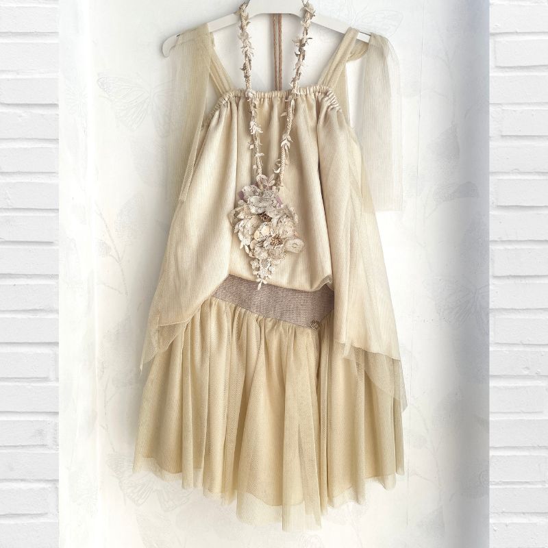 BELLA BIMBA COLLECTION PRIMAVERA-VERANO 2026, Colección BUSGOSU Conjunto compuesto en TOP largo con cola en tejido tul plumeti con lúrex y lazadas en hombros combinada con la falda vuelo de tul con lúrex y cintura delantera en tejido de fibras naturales con lúrex y parte trasera cintura engomada