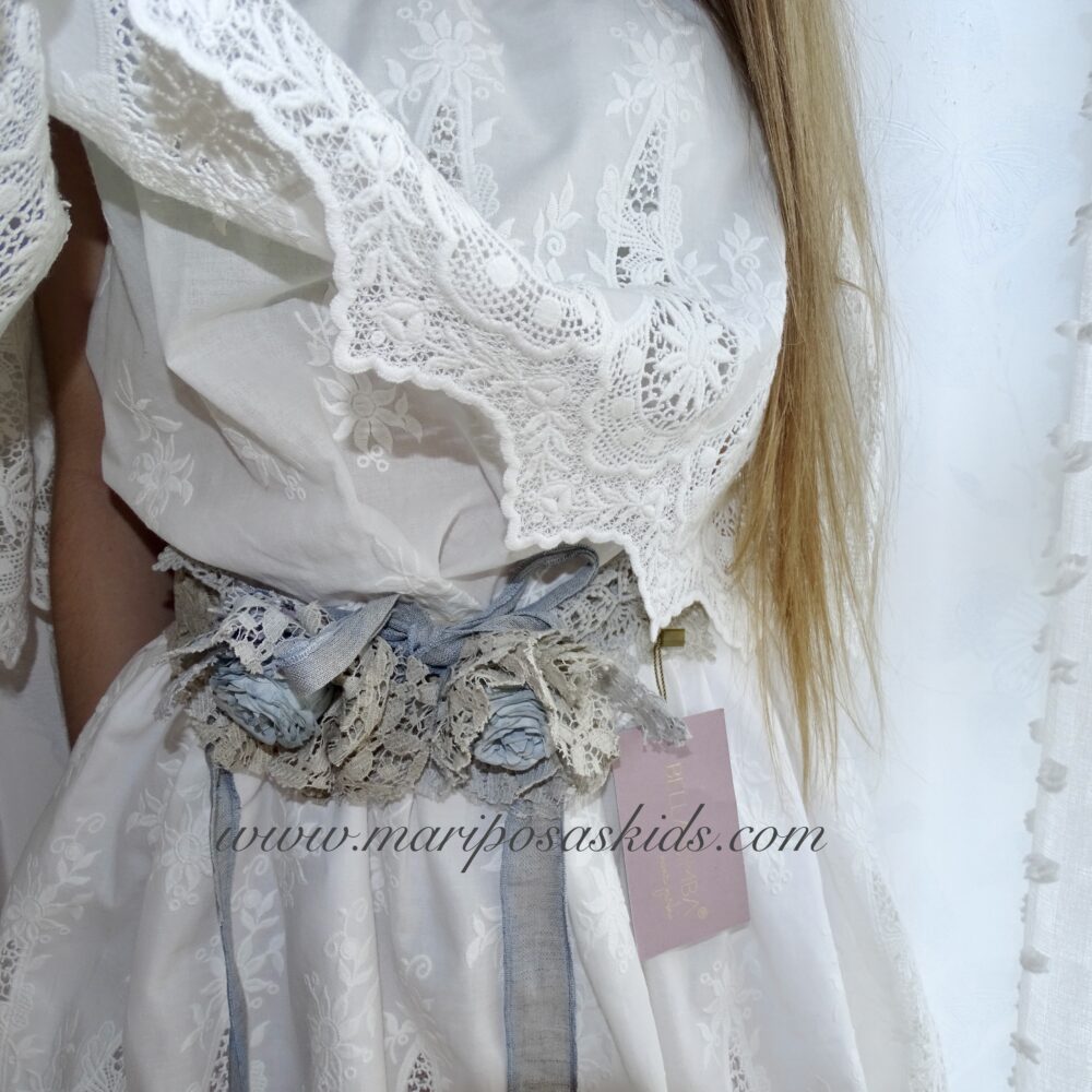 BELLA BIMBA COLLECTION PRIMAVERA-VERANO 2026, Colección EDRILLE, conjunto de blusa con falda en tejido de algodón BLANCO ROTO y guipur bordado de color blanco.