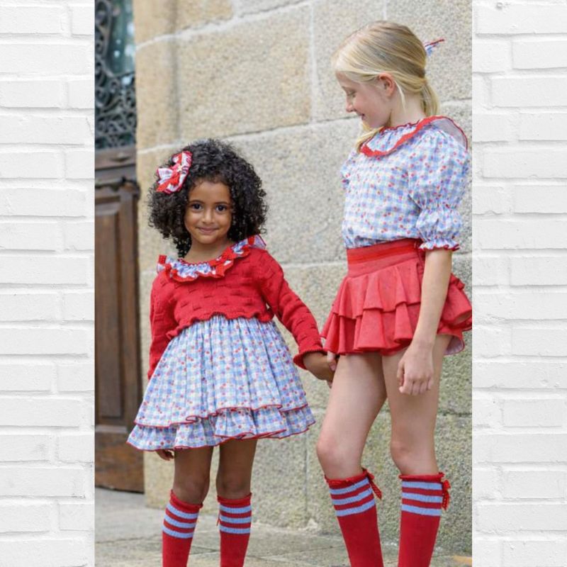 LOLITTOS colección CHERRY Primavera – Verano 2026, conjunto de blusa de cierre trasero abotonado de corte recto en tejido cuadro azul con estampado CEREZAS, destacan sus mangas faril y su cuello redondo con escote en espalda. Combina con short con volantes ( tipo falda) en tejido sarga color rojo cereza.