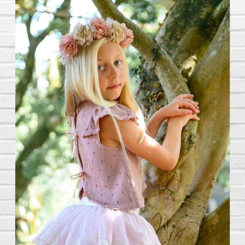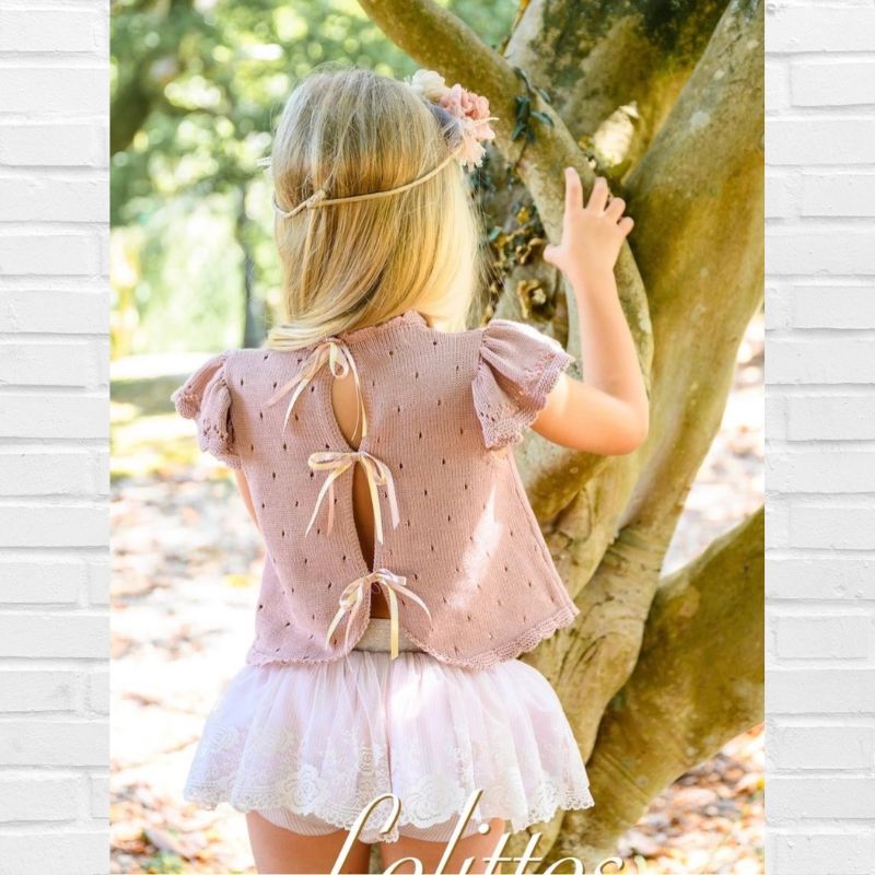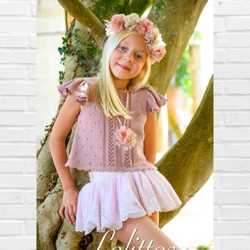 LOLITTOS colección DUQUESA Primavera – Verano 2026, conjunto compuesto por Top de punto en color ROSA EMPOLVADO, con volante sobre los hombros. Destaca su espalda con abertura, decorada con dos lazos de raso. Cierre trasero con botón. Falda/cubre en tul bordado con cubre en rallitas.