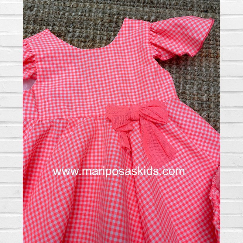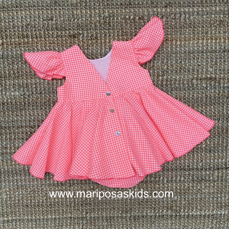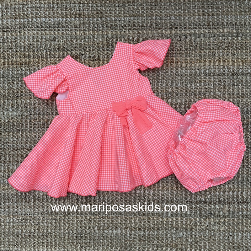 LOLITTOS colección SANTORINI Primavera – Verano 2026, jesusito con braguita en tejido vichy rosa chicle flúor. de talle cintura alta con mucho vuelo ( cortado al bies). espalada en pico con cierre trasero abotonado.