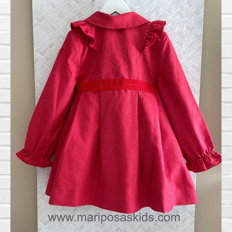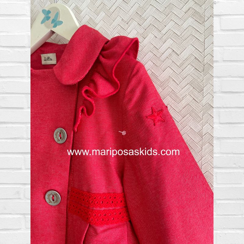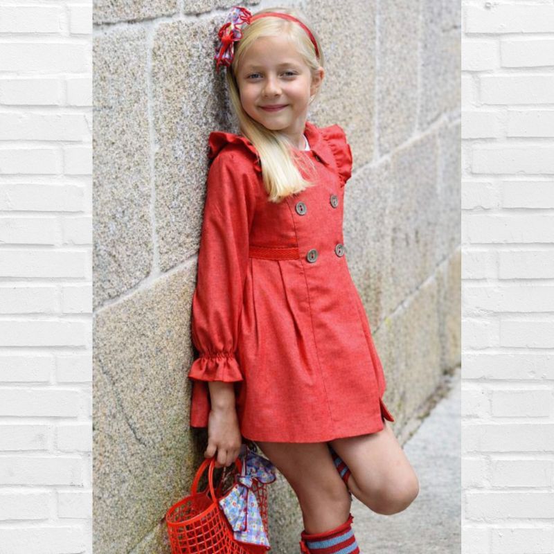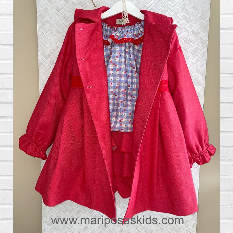 LOLITTOS colección CHERRY Primavera – Verano 2026, gabardina en color cereza de tallae cintura alta con semi-vuelo. con volantitos en hombros y cierre abotonado. Forro interior.