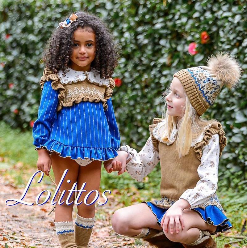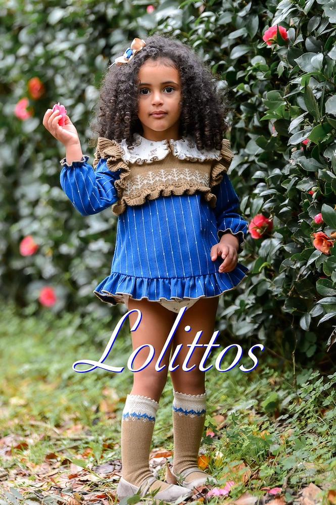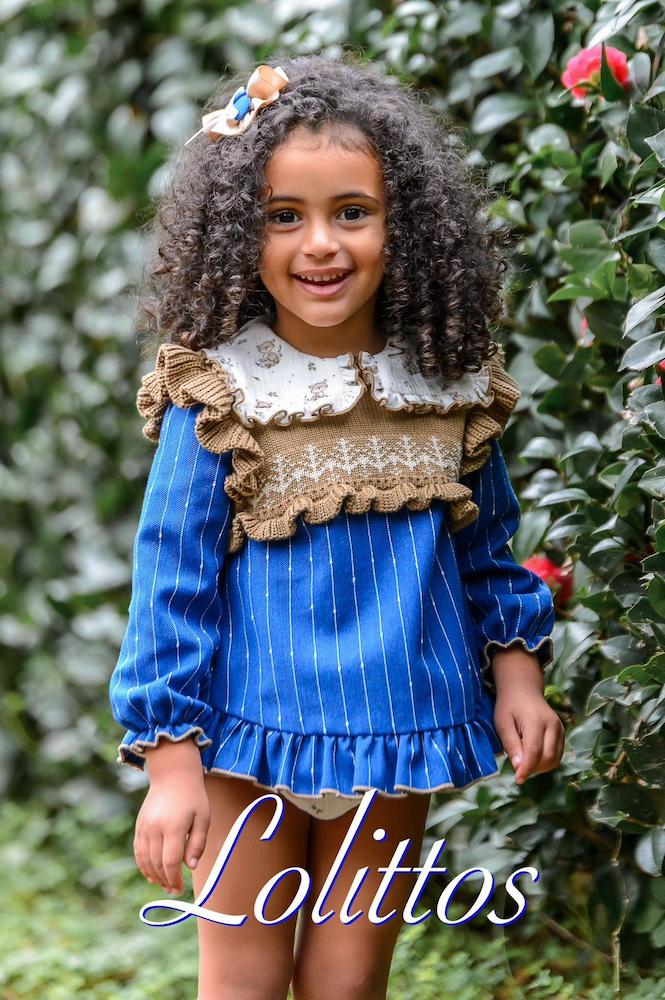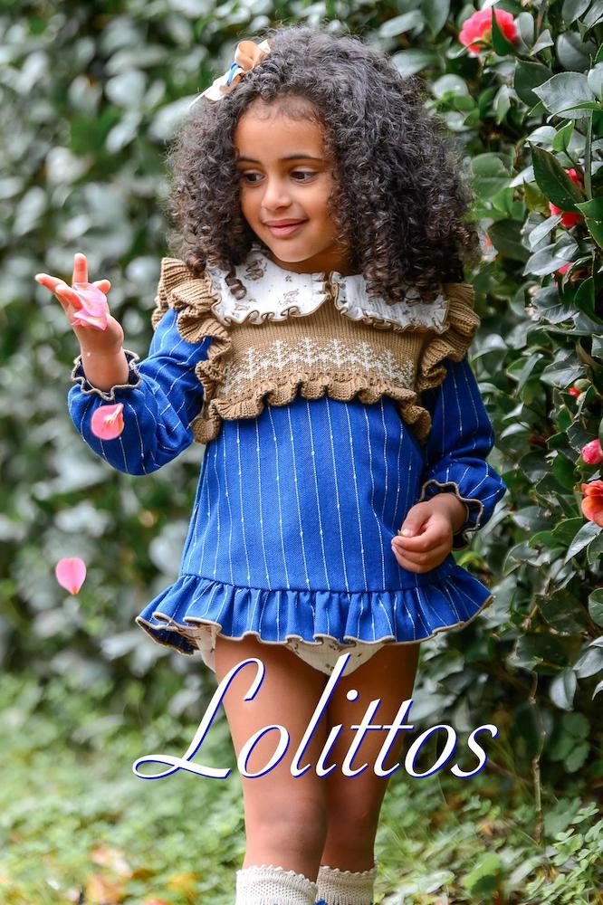 LOLITTOS Colección FÁBULA Otoño-Invierno 2025/26 , Jesusito de talle evasé, en tejido azulón con rayitas, destaca su cuello con solapa cuadrada con el mismo tejido que el cubre. A destacar su chaleco que da un toque muy elegante a la prenda. Cierre trasero abotonado.. Forro interior.