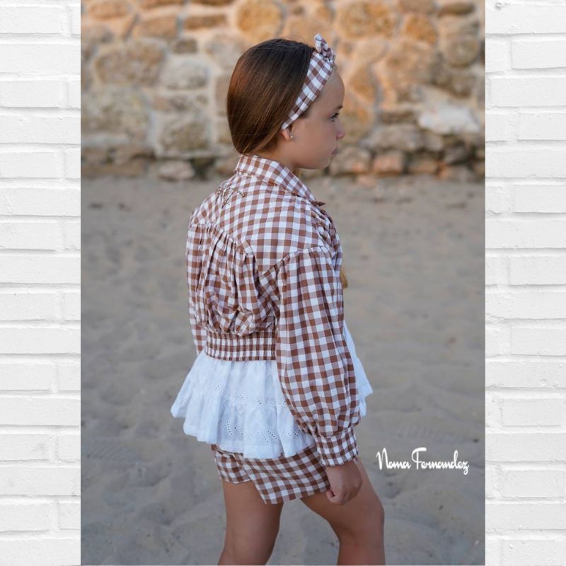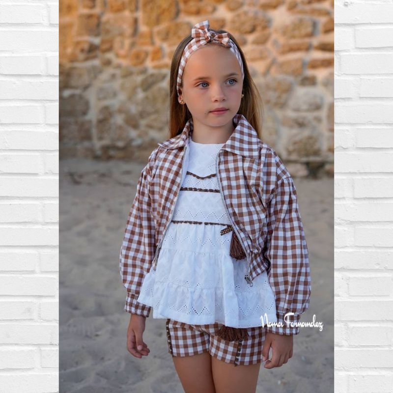 NOMA FERNÁNDEZ  Colección TILO Primavera/Verano 2026, bomber en tejido cuadros vichy marrón y blanco con engomado en cintura y puños.
