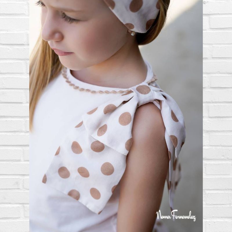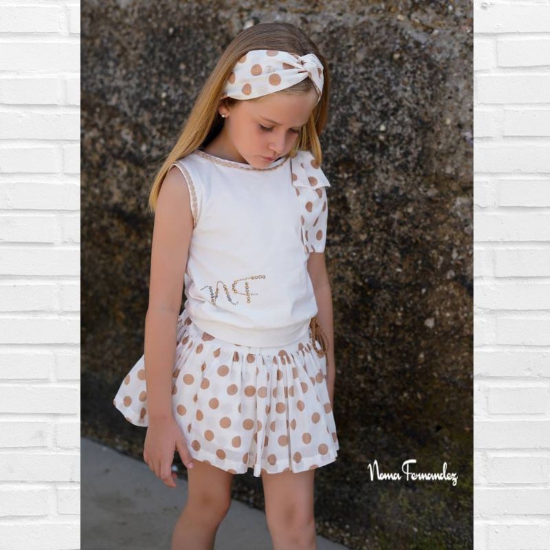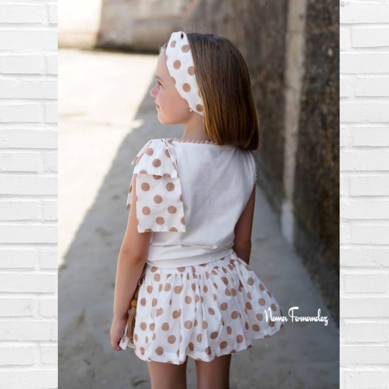 NOMA FERNÁNDEZ Colección HAYA Primavera/Verano 2026, conjunto compuesto por camiseta blanco roto de cuello redondo con detalles camel, cintura con elástico en el bajo y elegante lazo sobre honro del tejido de la falda.