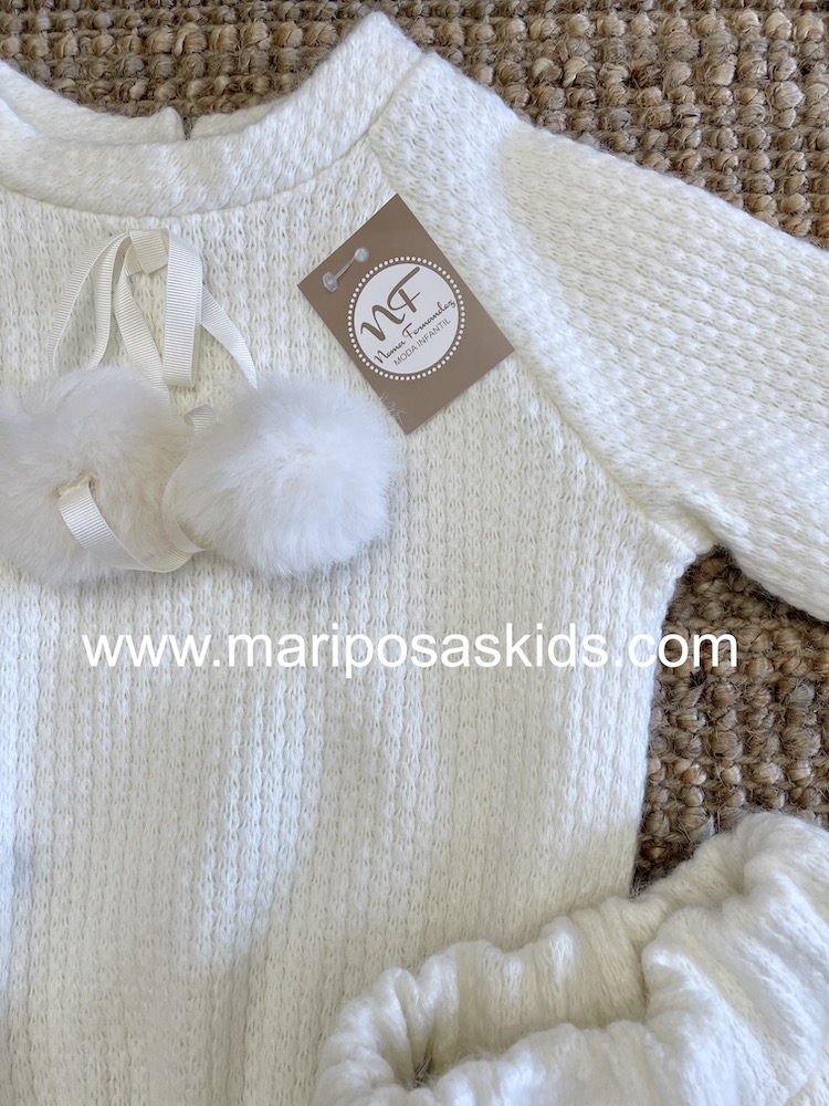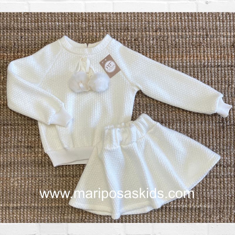 NOMA FERNÁNDEZ  Colección PENELOPE Otoño-Invierno 2025/26, conjunto niña compuesto de jersey con mangas ranglan y semi-cuello alto en tejido color marfil o blanco roto. Falda al bies con cintura ajustable.