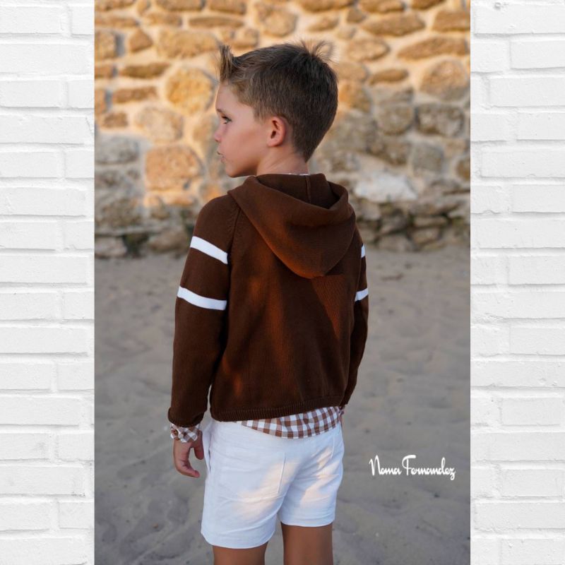 NOMA FERNÁNDEZ  Colección TILO Primavera/Verano 2026, Jersey punto marrón con detalles blancos 85.Con capucha.