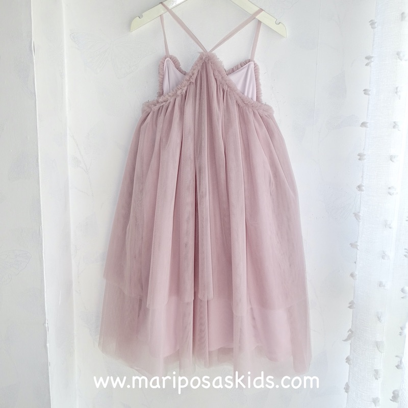 BELLA BIMBA COLLECTION PRIMAVERA-VERANO 2026, Colección DREAM, Vestido de tirantes fruncidos acabado en pico en la espalda, de doble capa de tul rosa empolvado con doble forro.