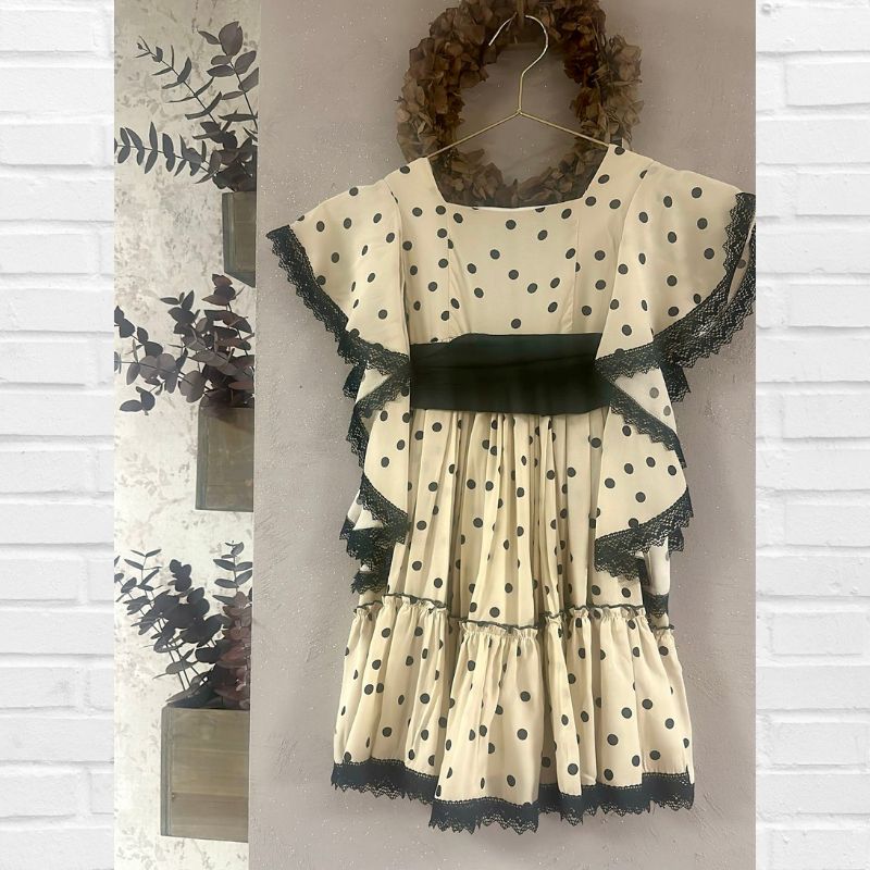 BELLA BIMBA COLLECTION PRIMAVERA-VERANO 2026, Colección SUN TRIANA, Vestido de tops negros sobre fondo beige entejido gasa de corte faralae con vuelo. Aberturas laterales para colocar el fajín negro ( incluido).