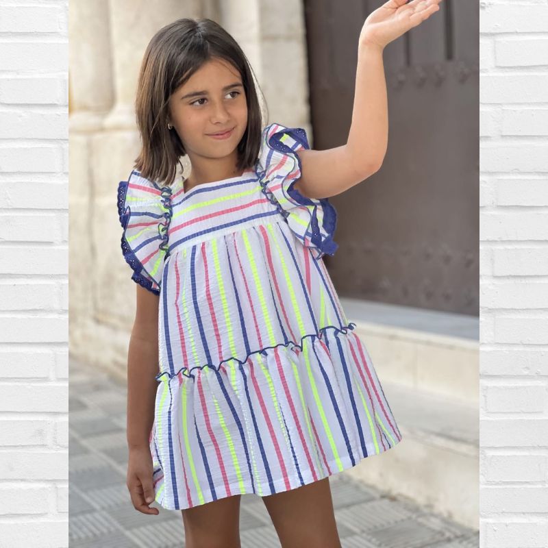 Lapeppa colección Primavera – Verano 2026, vestido en tejido rayas combinado con flúor, de talle canesú con volantes de mangas. De cuello caja por delante y por detrás. Corte muy favorecedor