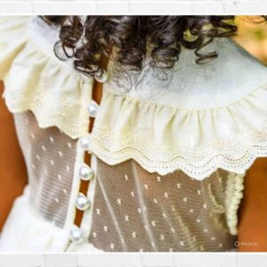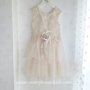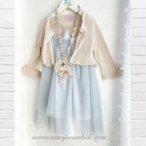 Colección AGUAMARINA, Vestido en tejido crepe fluido de corte cintura fruncido con gran volante. Acabado en encaje de algodón tipo bolillo. EXCLUSIVO PARA MARIPOSAS KIDS.