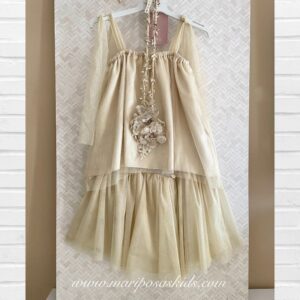 Vestido PRALINÉ, espectacular vestido en tul plumeti con detalles bordados en el bajo. A destacar su preciosa espalda en tul con cierre abotonado en botón perla.