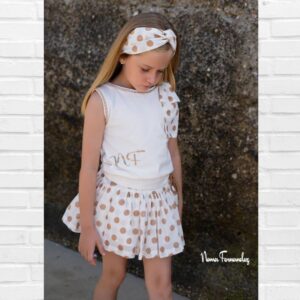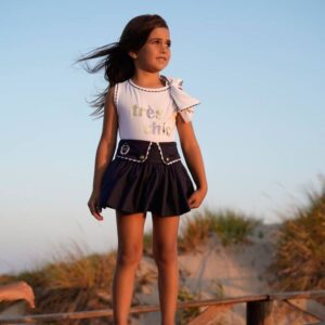 CONJUNTO OLMO, Conjunto super ponible y de lineas frescas, ideal para combinar con manoletinas en color marino para eventos. Camiseta con lazo en hombro acabado en cinta de abalorio combinada con falda de contura ancha con vuelo y olsillos laterales.