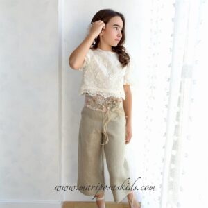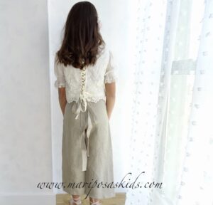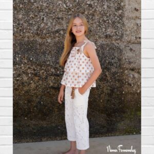 COLECCIÓN VOILE, Conjunto super especial compuesto en tejido VOILE en crudo en tejido con estampado 3D con mangas farol y espectacular espalda acordonada tipo corpiño, combinado con pantalón MIDI en tejido de fibras naturales con lúrex plata.