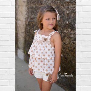 Conjunto DINASTIA, conjunto en algodón plumeti beige de talle canesú con volantes faralae combinado con short en lino.