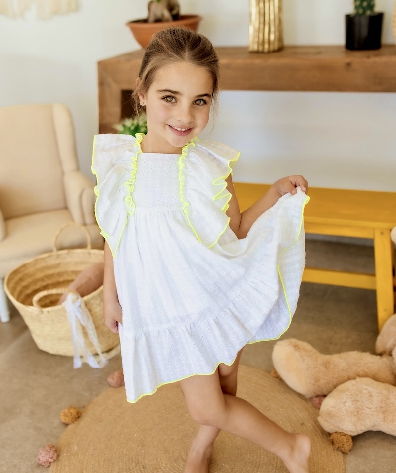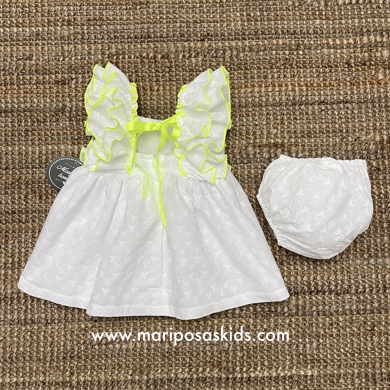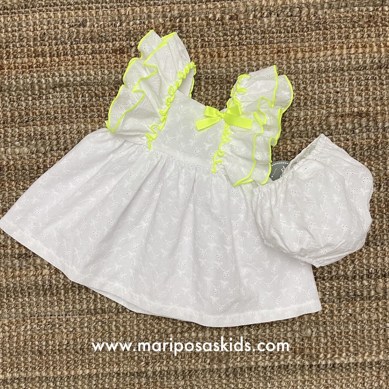 MON PETIT BONBON Colección FLÚOR Primavera-Verano 2025, en tejido de algodón bordado con ribeteado en flúor.