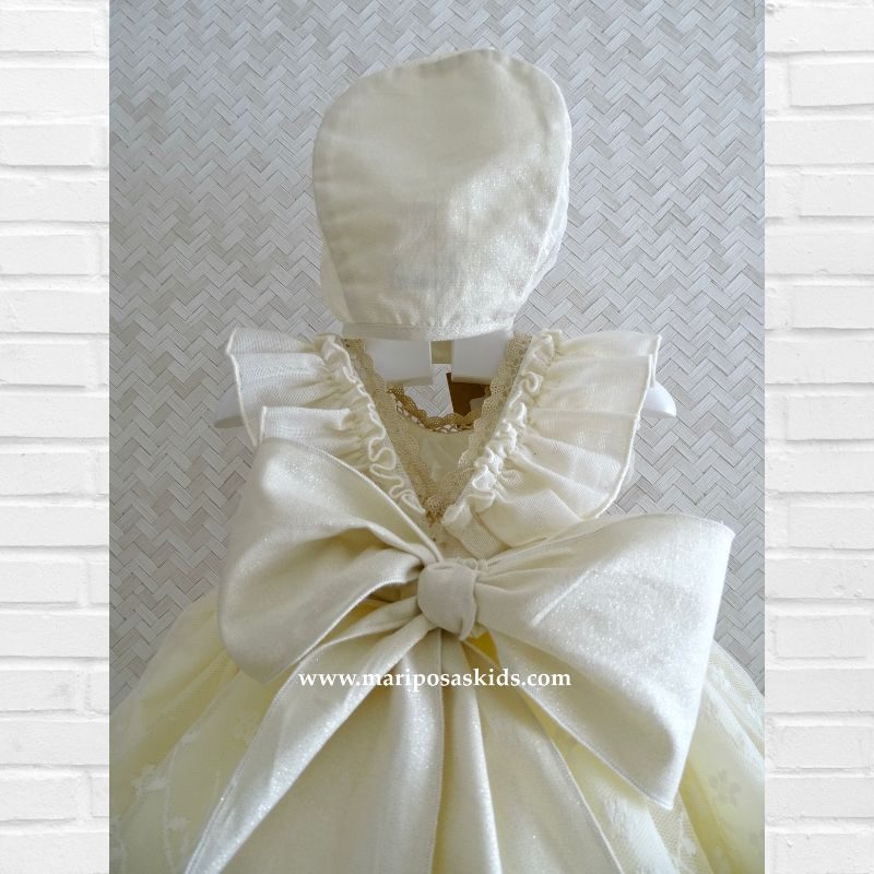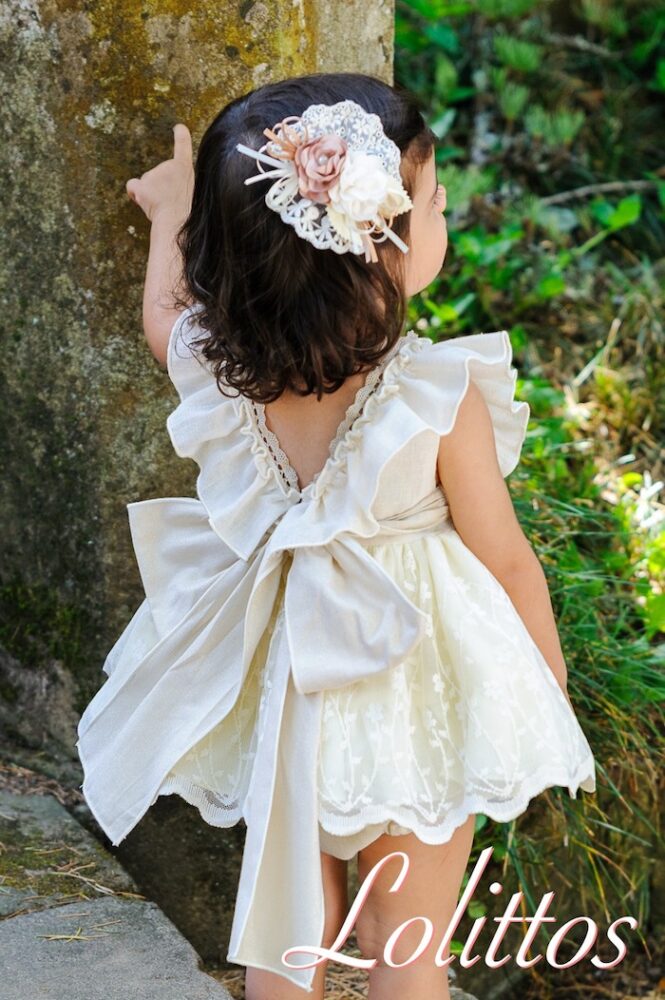 LOLITTOS colección DUNA Primavera – Verano 2025, Jesusito en color beige claro en tul bordado y lino arena. Con fajin incluido con bouquet floral y lazada en beige con matices brillantes. Doble Forro interior para dar volumen.