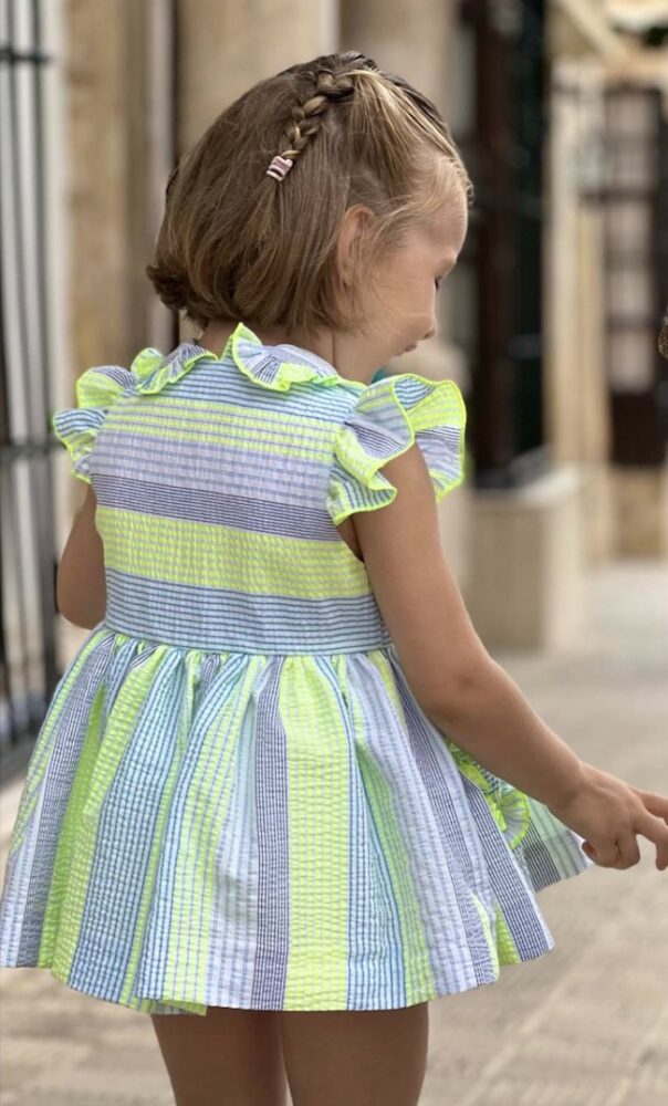 Lapeppa colección Primavera – Verano 2025, jesusito con graguitaj en corte cintura con vuelo , en tejido rayas azul y flúor.