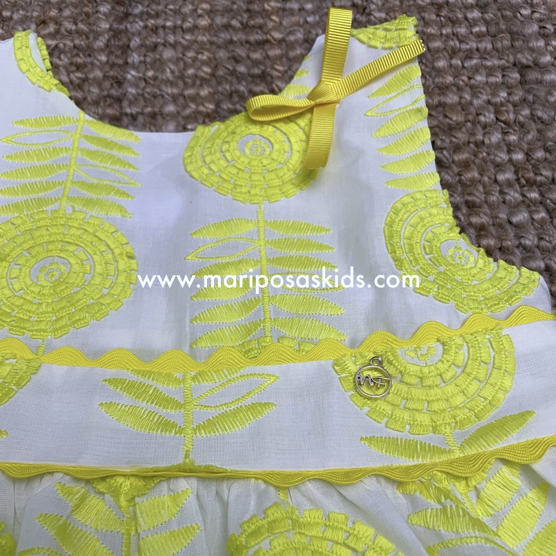 NOMA FERNÁNDEZ Colección TOLOUSE Primavera/Verano 2025, vestido en tejido bordado amarillo de talle cintura alta con tirantes. Forro interior.