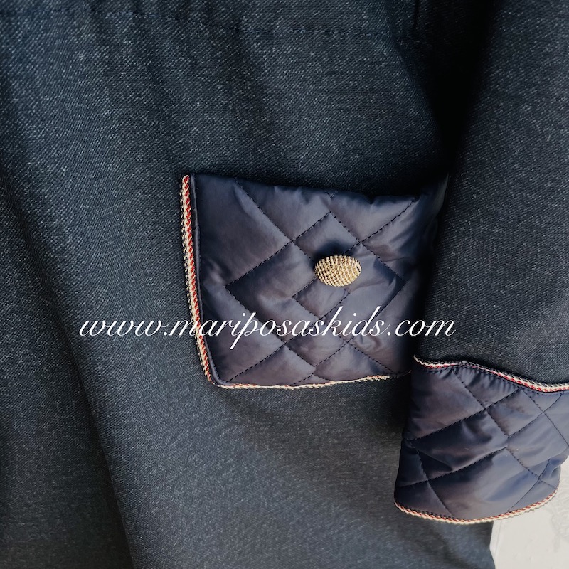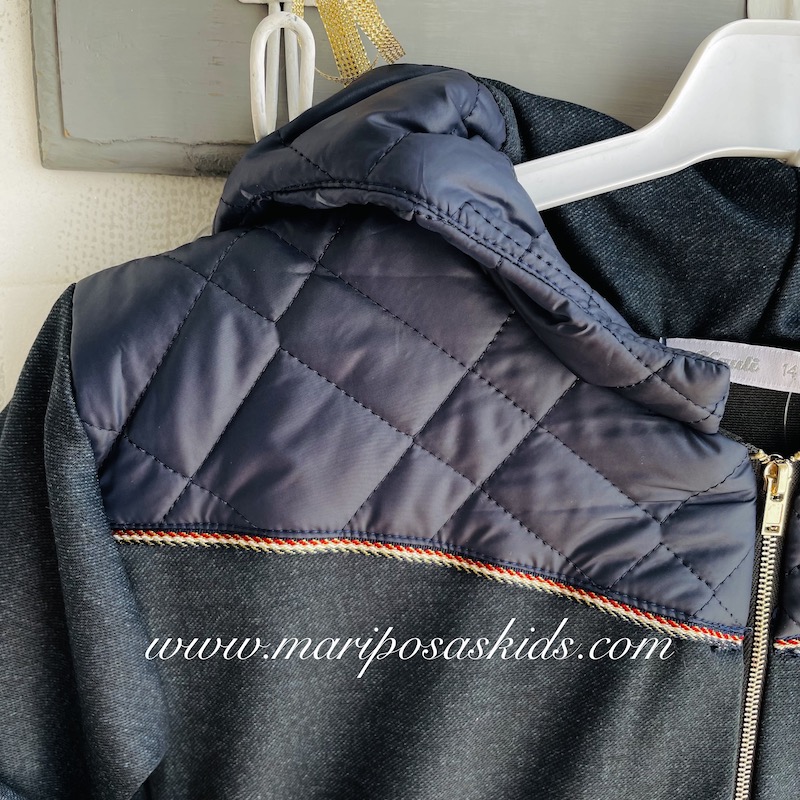 KAULI BLUSON colección DANUBIO Otoño-Invierno 2022/23, vestido AZUL MARINO en tejido felpa elástico jaspeado, de corte evasé con cintura elástica. Detalles de tejido guateado satinado en bolsillos, puños y capucha. Abertura cemallera delatera y terminaciones de cinta de abalorio dorado en puños, bajo bolsillos y capucha.