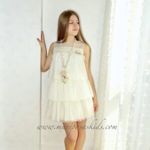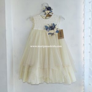 Colección AGUAMARINA, Vestido en tejido crepe fluido de corte cintura fruncido con gran volante. Acabado en encaje de algodón tipo bolillo. EXCLUSIVO PARA MARIPOSAS KIDS.