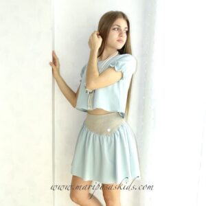 Colección AGUAMARINA FALDA, conjunto en tejido crepe fluido compuesto por falda fruncida en tejido fibras naturales con lúrex y blusa con mangas farol.