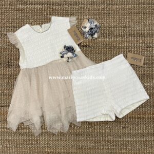 Colección Conjunto NOCHE conjunto de blusón en cuerpo crudo engomado en arena y parte inferior con volantes de tul arena. Short blanco roto con engomado arena.